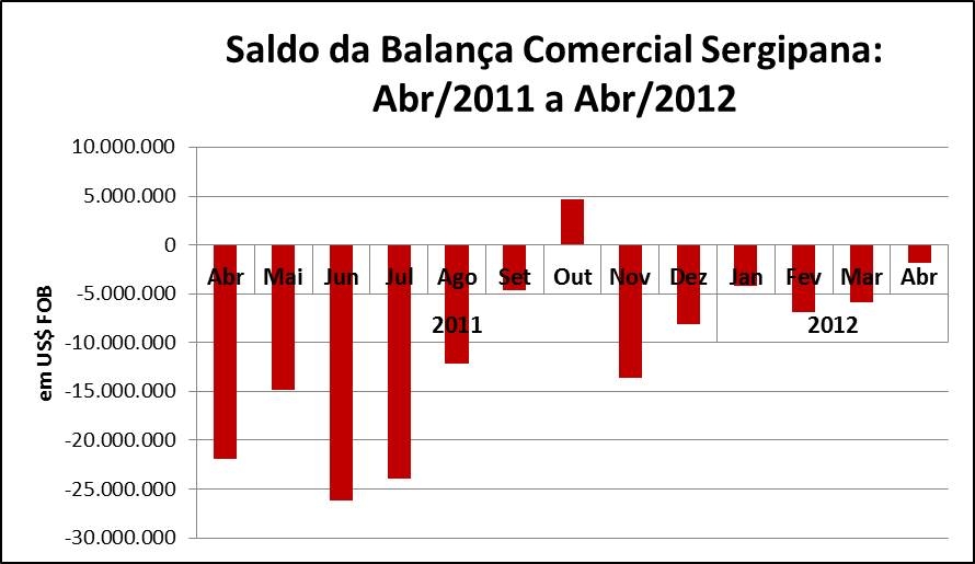 Análise realizada pelo Centro Internacional de Negócios – CIN/SE da FIES, com base nos dados do Ministério de Desenvolvimento, Indústria e Comércio Exterior (MDIC), apontou que, no quarto mês de 2012, encerrado com 19 dias úteis, a venda de produtos sergipanos para o exterior somou US$ 21,8 milhões, sendo 111,2% maior que o montante exportado no ultimo mês de março. Entretanto, no mês analisado, a balança comercial sergipana apresentou déficit de US$ 1,8 milhão, já que o montante importado (US$23,6 milhões) foi maior que as exportações. A corrente de comércio totalizou US$ 45,4 milhões.