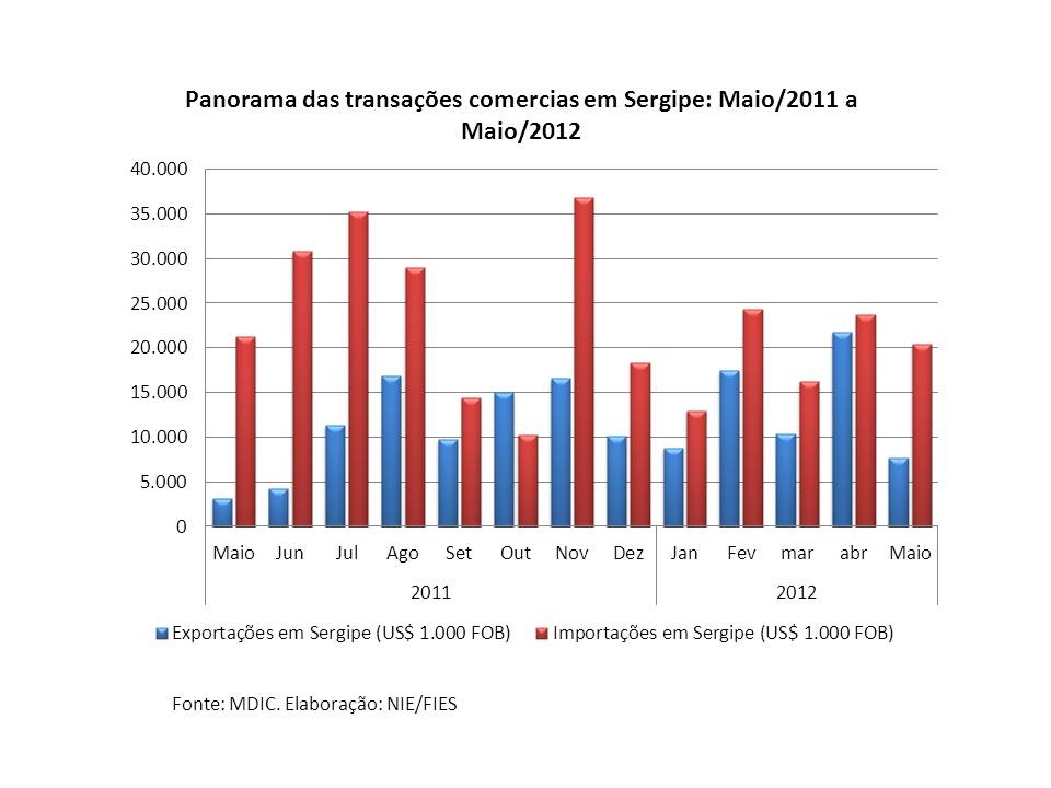 Análise realizada pelo Centro Internacional de Negócios – CIN/SE da FIES, com base nos dados do Ministério de Desenvolvimento, Indústria e Comércio Exterior (MDIC), apontou que, no quinto mês de 2012, encerrado com 19 dias úteis, a venda de produtos sergipanos para o exterior somou US$ 7,6 milhões, sendo 143,4% maior que o montante exportado no mês de maio do ano passado. Entretanto, no mês analisado, a balança comercial sergipana apresentou déficit de US$ 12,8 milhões, já que o montante importado (US$20,4 milhões) foi maior que as exportações. A corrente de comércio totalizou US$ 28 milhões.