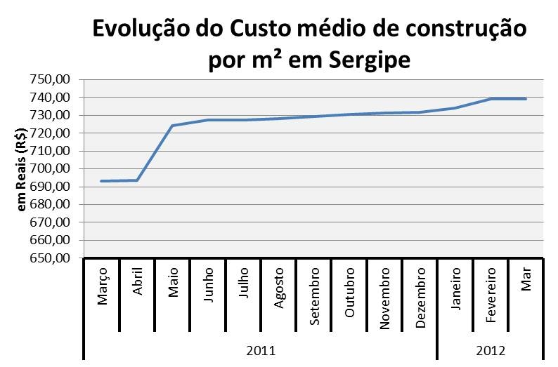 O custo médio de construção, por metro quadrado (m²), em Sergipe, no mês passado, ficou em R$ 738,96, maior somente que os custos dos estados do Rio Grande do Norte e Espírito Santo.