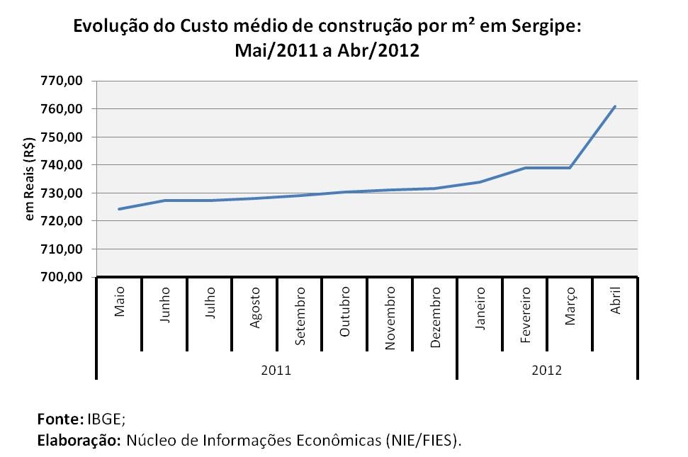 O custo médio da construção civil, em Sergipe, foi R$760,96 por metro quadrado (m²), em abril, enquanto que o custo médio do mês de março foi R$ 738,96. Apesar desse aumento, o custo de construção do estado situou-se entre os quatro menores do país no mês de abril.