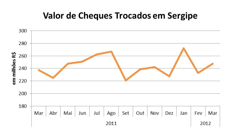 Análise realizada pelo Boletim Sergipe Econômico, parceria do Núcleo de Informações Econômicas da Federação das Indústrias do Estado de Sergipe (FIES) e do Departamento de Economia da UFS, com base nas estatísticas do Banco Central, mostrou variação positiva no valor de cheques trocados, compensados e liquidados, em Sergipe, no terceiro mês do ano. Em março de 2012, o valor de cheques trocados alcançou R$ 247,7 milhões, apresentando expansão de 6,4%, frente ao valor total dos cheques trocados em fevereiro último. Em relação ao mesmo mês do ano anterior (março/2011), o valor dos cheques compensados no estado registrou alta de 4,3%. No primeiro trimestre de 2012, o valor dos cheques trocados acumulou R$ 752,6 milhões, sendo 4,3% superior ao valor acumulado nos primeiros três meses de 2011.
