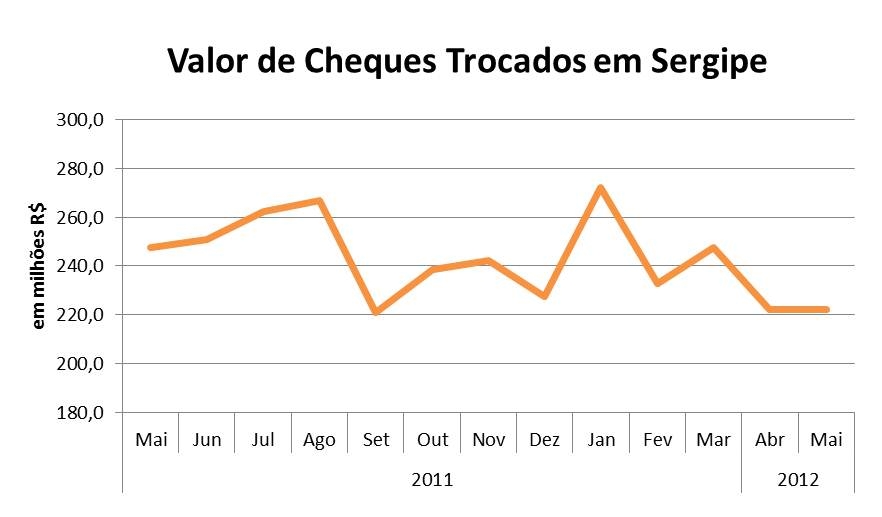 Análise realizada pelo Boletim Sergipe Econômico, parceria do Núcleo de Informações Econômicas da Federação das Indústrias do Estado de Sergipe (FIES) e do Departamento de Economia da UFS, com base nas estatísticas do Banco Central, mostrou que não houve variação significativa no valor de cheques trocados, compensados e liquidados, em Sergipe, no quinto mês do ano. Em maio de 2012, o valor de cheques trocados alcançou R$ 222,2 milhões, mantendo-se, praticamente, estável frente ao valor total dos cheques trocados em abril último. Em relação ao mesmo mês do ano anterior (maio/2011), o valor dos cheques compensados no estado registrou queda, variando negativamente 10,2%.