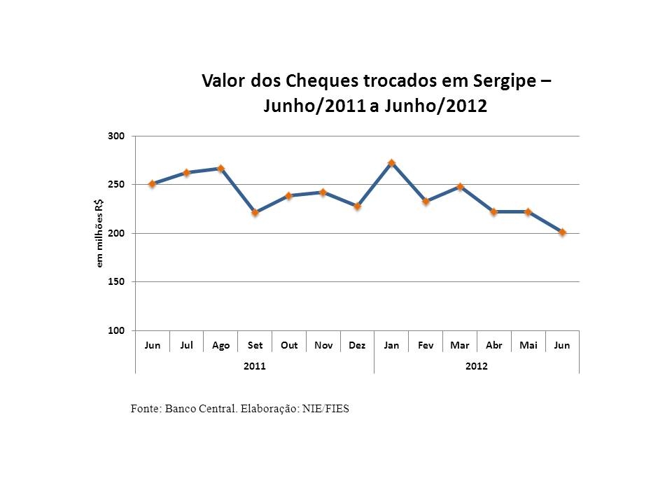Análise realizada pelo Boletim Sergipe Econômico, parceria do Núcleo de Informações Econômicas da Federação das Indústrias do Estado de Sergipe (FIES) e do Departamento de Economia da UFS, com base nas estatísticas do Banco Central, mostrou que, em junho de 2012, o valor de cheques trocados alcançou R$ 201,1 milhões, sendo 9,5% menor que o valor dos cheques compensados em maio último. Em relação ao mesmo mês do ano anterior (junho/2011), o valor dos cheques compensados no estado registrou queda ainda maior, variando negativamente 19,8%. Na análise semestral, o valor de cheques trocados se mostrou 3,3% inferior ao valor dos cheques compensados no mesmo período de 2011.