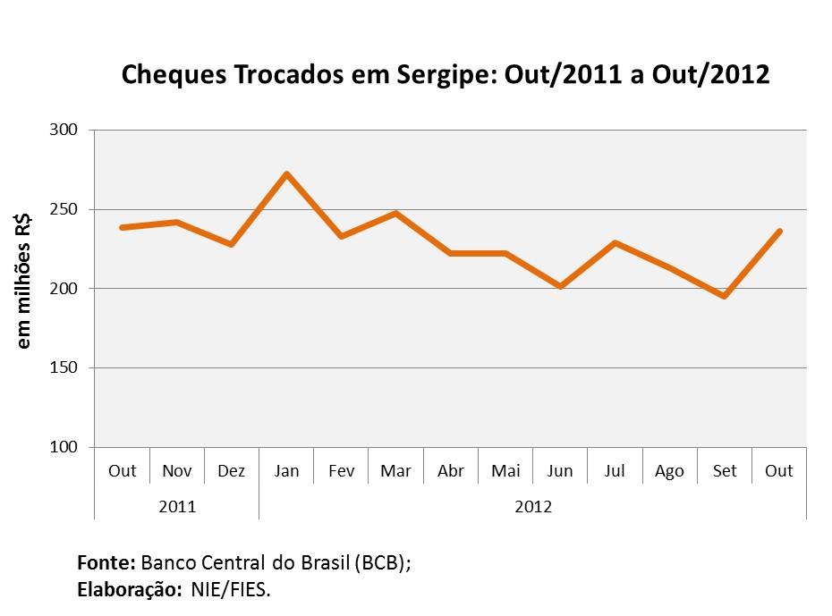 Análise realizada pelo Boletim Sergipe Econômico, parceria do Núcleo de Informações Econômicas da Federação das Indústrias do Estado de Sergipe (FIES) e do Departamento de Economia da UFS, com base nas estatísticas do Banco Central, mostrou que, em outubro de 2012, o valor de cheques trocados alcançou R$ 236,4 milhões, sendo 22,2% maior que o valor dos cheques compensados em setembro último. Em relação ao mesmo mês do ano anterior (outubro/2011), o valor dos cheques compensados, no estado, registrou leve queda, variando negativamente 0,8%.