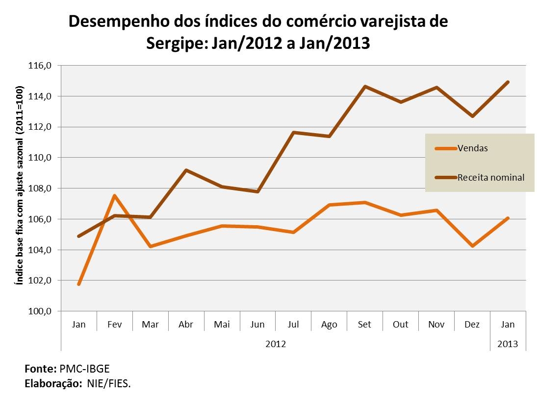Análise realizada pelo Boletim Sergipe Econômico, parceria do Núcleo de Informações Econômicas da Federação das Indústrias do Estado de Sergipe (FIES) e do Departamento de Economia da UFS, com base nos dados da Pesquisa Mensal do Comércio (PMC) do IBGE, apontou que as vendas do comércio varejista elevaram-se 3,9% em janeiro deste ano, sobre o mesmo mês de 2012. No comparativo mensal (dezembro/2012), nos dados com ajuste sazonal, verificou-se que as vendas no comércio varejista registraram avanço de 1,7%.