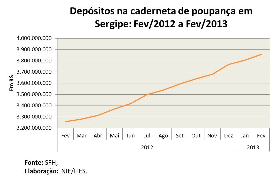 Análise realizada pelo Boletim Sergipe Econômico, parceria do Núcleo de Informações Econômicas da Federação das Indústrias do Estado de Sergipe (FIES) e do Departamento de Economia da UFS, com base nos dados do Banco Central, revelou que os depósitos na caderneta de poupança, em Sergipe, no mês de fevereiro, continuaram crescentes. Os depósitos totalizaram R$ 3,85 bilhões em fevereiro último. Na comparação com o mesmo mês de 2012, houve expansão de 18,4%, enquanto no comparativo mensal (janeiro/2013), a alta foi de 1,3%.