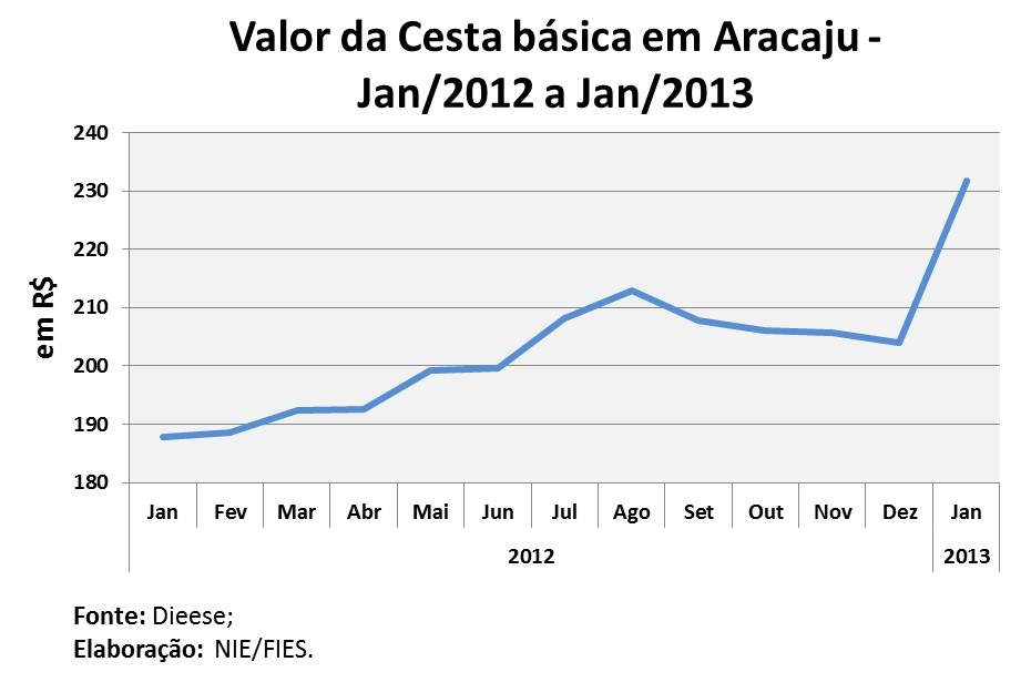 Análise realizada pelo Boletim Sergipe Econômico, parceria do Núcleo de Informações Econômicas da Federação das Indústrias do Estado de Sergipe (FIES) e do Departamento de Economia da UFS, com base nos dados da Pesquisa Nacional da Cesta Básica, realizada pelo DIEESE, apontou que o valor da cesta básica registrado na capital sergipana, no primeiro mês de 2013, foi R$ 231,80, sendo 13,6% maior na comparação com o mês anterior (dezembro/2012). Em relação a janeiro de 2012, o valor da cesta básica apresentou elevação de 23,4%. Essa foi a terceira maior alta dentre as 17 capitais pesquisadas, nessa mesma comparação, ficando atrás somente de Natal (26,2%) e Salvador (24,9%).