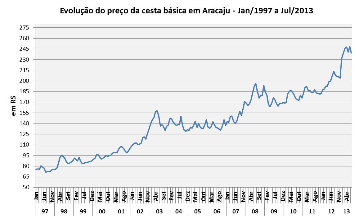 Análise realizada pelo Boletim Sergipe Econômico, parceria do Núcleo de Informações Econômicas da Federação das Indústrias do Estado de Sergipe (FIES) e do Departamento de Economia da UFS, com base nos dados da Pesquisa Nacional da Cesta Básica, realizada pelo DIEESE, apontou que o valor da cesta básica registrado na capital sergipana, em julho deste ano, foi R$ 239,36, apresentando redução de 3,5%, na comparação com o mês anterior (junho/2013). Em relação a julho de 2012, o valor da cesta básica apresentou elevação de 15% (sem levar em consideração a inflação do período).