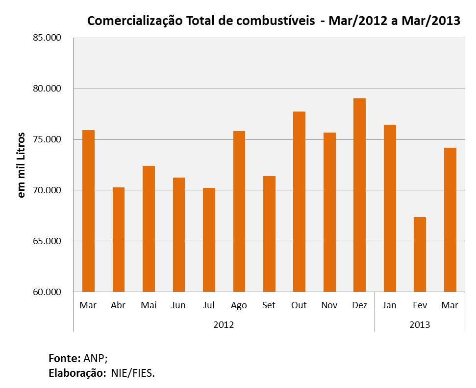 As vendas do óleo diesel recuaram 9,0%, em relação ao terceiro mês de 2012. O volume vendido em março deste ano foi de 29,5 milhões de litros, apresentando acréscimo de 11,2% nas vendas em relação a fevereiro último.