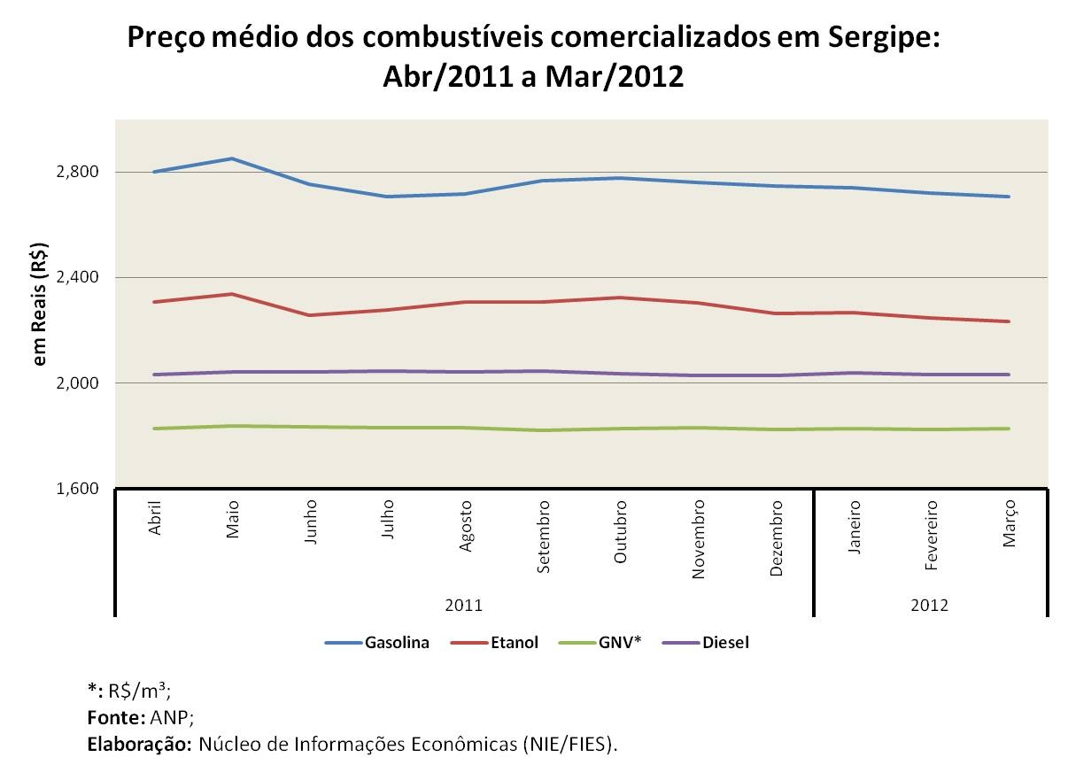 Sobre o preço do litro dos combustíveis fornecido pelas distribuidoras para os postos sergipanos, em março de 2012, foram apurados os seguintes valores: o preço médio para o etanol foi R$ 1,893; para a gasolina, o preço médio foi de R$ 2,362; e para o óleo diesel, R$ 1,852 pelo litro fornecido. O GNV teve preço médio de R$ 1,391.