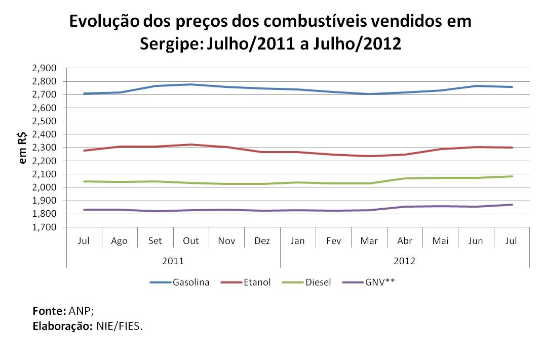 Análise realizada pelo Boletim Sergipe Econômico, parceria do Núcleo de Informações Econômicas da Federação das Indústrias do Estado de Sergipe (FIES) e do Departamento de Economia da UFS, com base nos dados da ANP, sobre os preços coletados do dia primeiro de julho até o último dia do mês, revelou que o preço médio, por litro, da gasolina vendida no estado encolheu 0,25% em relação ao mês anterior (junho/2012). O preço médio do litro foi R$ 2,760, sendo 1,92% superior ao preço médio praticado em julho do ano passado. Os preços mínimo e máximo, coletados em 241 postos em todo o estado, durante o mês passado, foram R$ 2,529 e R$ 2,949, respectivamente.