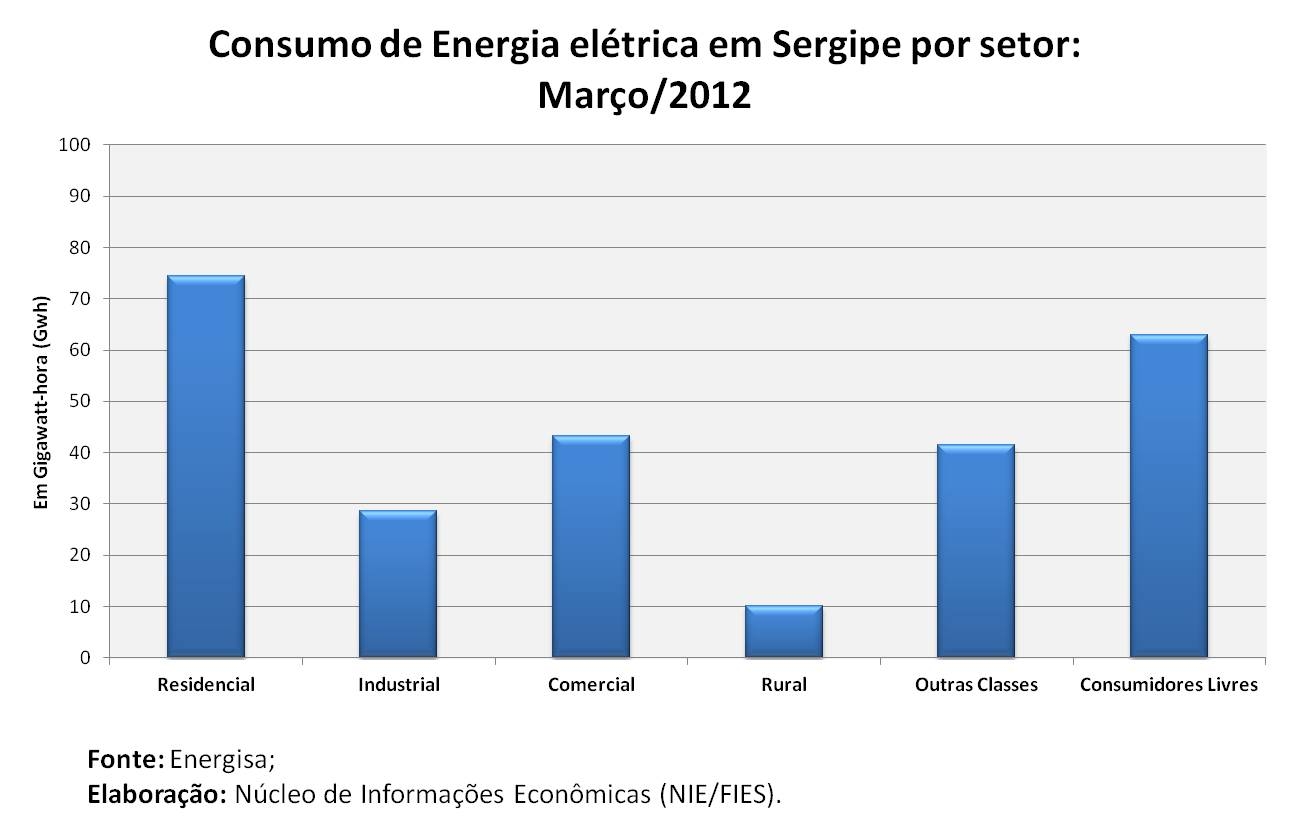 Análise realizada pelo Boletim Sergipe Econômico, parceria do Núcleo de Informações Econômicas da Federação das Indústrias do Estado de Sergipe (FIES) e do Departamento de Economia da UFS, com base nos dados da Energisa, (que gera e distribui energia para 63 municípios sergipanos, alcançando 96% do território do estado), constatou que o consumo de energia elétrica, em março de 2012, no estado, chegou a 197,9 Gigawatt-hora (Gwh), representando crescimento de 6,4%, em relação ao mês anterior. Em relação a março de 2011, houve crescimento no consumo de energia elétrica de 3,3%.