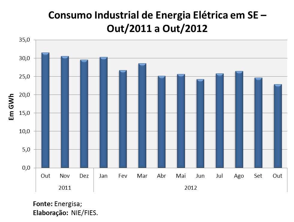 Análise realizada pelo Boletim Sergipe Econômico, parceria do Núcleo de Informações Econômicas da Federação das Indústrias do Estado de Sergipe (FIES) e do Departamento de Economia da UFS, com base nos dados da Energisa (que gera e distribui energia para 96% do território do estado), constatou que houve leve aumento no consumo total de energia elétrica de 0,8% no mês de outubro desse ano, em relação ao mesmo mês de 2011. O consumo de energia elétrica, no mês analisado, em Sergipe, chegou a 179,4 Gigawatt-hora (Gwh), apresentando elevação de 4,4%, em relação ao mês anterior.