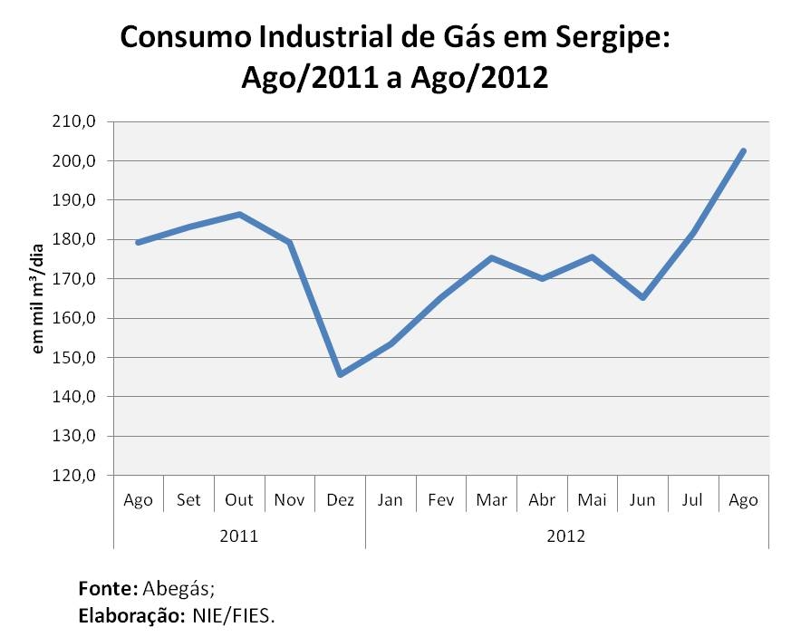 O consumo industrial de gás foi 11,4% maior que o consumo do mês de julho último. Na comparação anual, o consumo apresentou elevação de 13%, em relação ao mesmo mês do ano passado (agosto/2011).