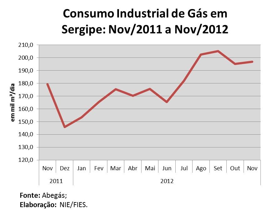 Análise realizada pelo Boletim Sergipe Econômico, parceria do Núcleo de Informações Econômicas da Federação das Indústrias do Estado de Sergipe (FIES) e do Departamento de Economia da UFS, com base nos dados da Abegás, apontou que foram consumidos, em novembro deste ano, uma média de 196,9 mil metros cúbicos (m³) de gás, diariamente, pelas indústrias sergipanas. O consumo industrial de gás foi 1% maior que o consumo do mês de outubro último. Na comparação anual, o consumo apresentou elevação de 10%, em relação ao mesmo mês do ano passado (novembro/2011).