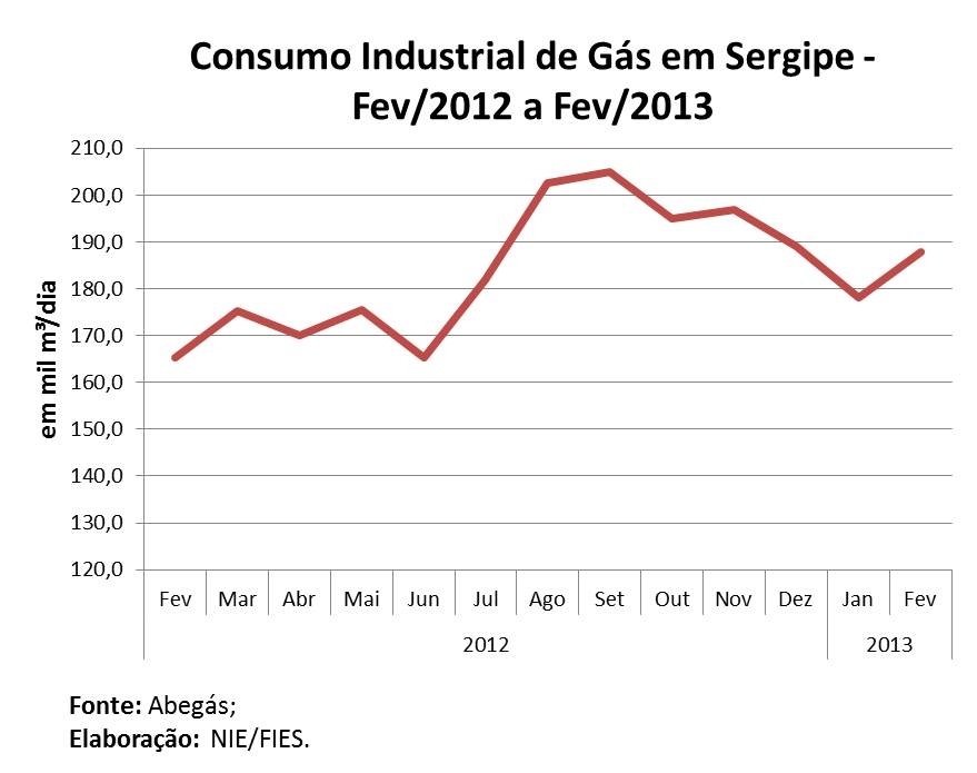 Análise realizada pelo Boletim Sergipe Econômico, parceria do Núcleo de Informações Econômicas da Federação das Indústrias do Estado de Sergipe (FIES) e do Departamento de Economia da UFS, com base nos dados da Abegás, apontou que foram consumidos, no segundo mês do ano, uma média de 187,8 mil metros cúbicos (m³) de gás, diariamente, pelas indústrias sergipanas, volume recorde para meses de fevereiro de acordo com a série histórica iniciada em 2007. O consumo industrial de gás foi 5,4% maior que o consumo do mês de janeiro último. Na comparação anual, o consumo apresentou elevação de 13,6%, em relação ao mesmo mês do ano passado (fevereiro/2012).