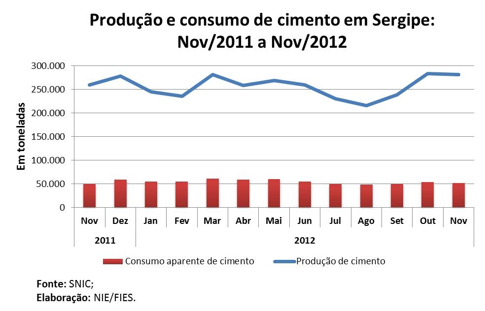 Análise realizada pelo Boletim Sergipe Econômico, parceria do Núcleo de Informações Econômicas da Federação das Indústrias do Estado de Sergipe (FIES) e do Departamento de Economia da UFS, com base nos últimos dados publicados pelo Sindicato Nacional da Indústria do Cimento, revelou que, em Sergipe, o consumo aparente de cimento chegou a 51,3 mil toneladas, no penúltimo mês de 2012. A quantidade consumida de cimento foi 4,5% maior na comparação anual (novembro/2011). Em relação ao mês anterior (outubro/2012), entretanto, o consumo foi 4,8% menor.