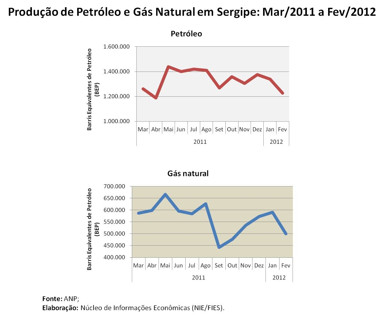 Análise realizada pelo Boletim Sergipe Econômico, parceria do Núcleo de Informações Econômicas da Federação das Indústrias do Estado de Sergipe (FIES) e do Departamento de Economia da UFS, com base nos dados da ANP (Agência Nacional de Petróleo), revelou que a produção de petróleo em Sergipe no segundo mês do ano foi de 1,2 milhão de barris equivalentes de petróleo (bep). A produção apresentou um leve recuo mensal, sendo que para o mês de fevereiro este recuo foi de 8,5%. Porém, em comparação com o mês de fevereiro de 2011, houve expansão de 5,7%. Somada à produção de janeiro, o total produzido foi de 2,5 milhões de barris, sendo 4,9% superior ao registrado no primeiro bimestre de 2011. Do total produzido no estado, em fevereiro, 78,7% foi de origem terrestre, enquanto os 21,3% restantes foram de origem marítima.