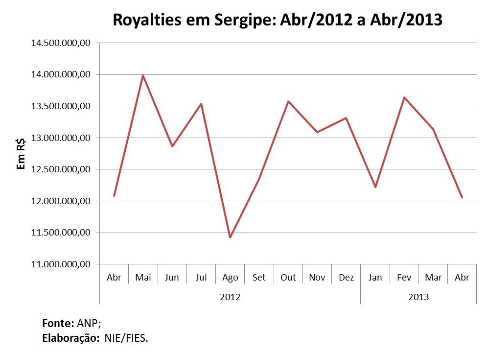 Análise realizada pelo Boletim Sergipe Econômico, parceria do Núcleo de Informações Econômicas da Federação das Indústrias do Estado de Sergipe (FIES) e do Departamento de Economia da UFS, com base nos dados da ANP, indicou que o pagamento de royalties do petróleo e gás natural, em Sergipe, ficou em pouco mais de R$ 12 milhões, no quarto mês desse ano. A compensação registrou queda de 0,2% na comparação com abril do ano passado. Entre março e abril deste ano, também houve recuo de 8,2%.