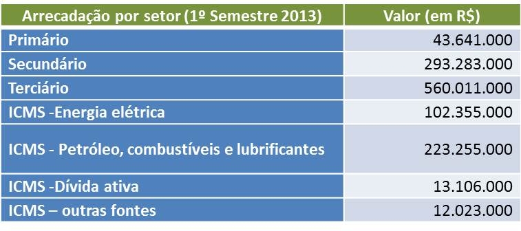 No primeiro semestre foram recolhidos dos setores primário, secundário e terciário do estado mais de R$ 895 milhões. Pelo uso da energia elétrica foram pagos R$ 102,3 milhões enquanto que pela comercialização de petróleo, combustíveis e lubrificantes destinou-se mais de R$ 220 milhões aos cofres do estado.