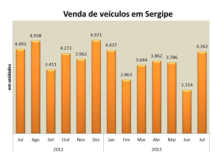 Análise realizada pelo Boletim Sergipe Econômico, parceria do Núcleo de Informações Econômicas da Federação das Indústrias do Estado de Sergipe (FIES) e do Departamento de Economia da UFS, com base nos dados da FENABRAVE, apontou que as vendas de veículos no estado, apesar de registrar queda de 2,9% em julho deste ano ante o mesmo mês do ano passado, apresentou o segundo melhor resultado em vendas de 2013. Foram comercializadas 4.362 unidades de veículos automotores em Sergipe, total menor apenas que as vendas de janeiro desse ano (4.437 unidades). As vendas registraram crescimento de 88,5% em relação ao último mês de junho.