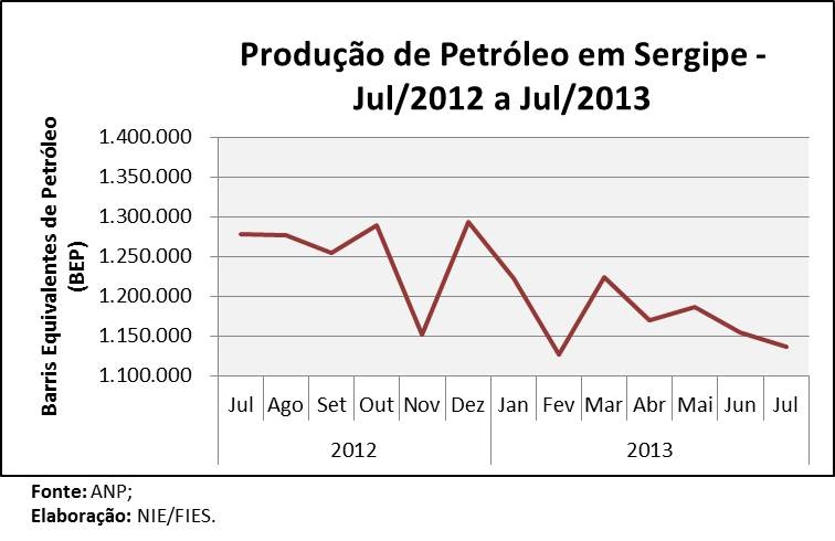 Análise realizada pelo Boletim Sergipe Econômico, parceria do Núcleo de Informações Econômicas da Federação das Indústrias do Estado de Sergipe (FIES) e do Departamento de Economia da UFS, com base nos dados da ANP, mostrou que a produção de petróleo no estado, em julho deste ano, superou 1,1 milhão de barris equivalentes de petróleo (bep), sendo 1,5% menor, em relação ao mês anterior (junho/2013). Comparando com julho de 2012, a produção foi 11% menor. A produção em terra foi responsável por 79,3% do total produzido.