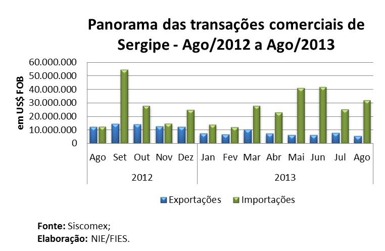 Análise realizada pelo Centro Internacional de Negócios – CIN/SE da FIES, com base nos dados do Ministério de Desenvolvimento, Indústria e Comércio Exterior (MDIC), observou que as exportações sergipanas, no mês de agosto de 2013, totalizaram US$ 5,3 milhões. O montante foi o menor registrado esse ano e apresentou recuo tanto em relação ao mesmo mês do ano passado (-56,3%), quanto na análise mensal (julho/2013), com uma redução de 31,8%. As importações somaram US$ 32,3 milhões no mês analisado, 150% acima do valor contabilizado em agosto de 2012, quando somaram US$ 12,8 milhões. O montante importado também cresceu em relação ao último mês de julho, sendo 26,3% maior que o valor registrado naquele mês. Com estes resultados, a balança comercial sergipana apresentou um déficit de US$ 26,9 milhões no mês de agosto. De janeiro a agosto desse ano, as vendas ao exterior somaram US$ 57,5 milhões, enquanto as importações totalizaram US$ 219,3 milhões, no período.