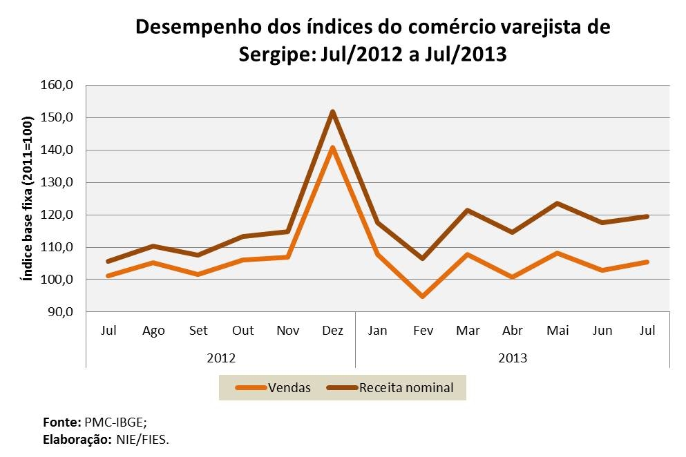 A receita nominal decorrente das vendas registrou expansão de 13,1% quando comparado com o sétimo mês do ano passado. No comparativo com junho último, verificou-se incremento de 1,1% na receita. De janeiro a julho deste ano, a receita nominal acumula alta de 13,2%.