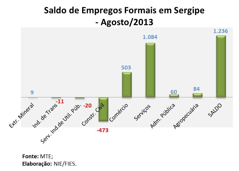 Análise realizada pelo Boletim Sergipe Econômico, uma parceria do Núcleo de Informações Econômicas (NIE) da Federação das Indústrias do Estado de Sergipe (FIES) e do Departamento de Economia da UFS, baseada em dados do Cadastro Geral de Empregados e Desempregados (CAGED), do MTE, revelou que, no mês de agosto de 2013, o saldo de empregos (total de admissões menos total de desligamentos) com carteira assinada foi de 1.236 novos postos de trabalho. O bom desempenho de agosto foi impulsionado, principalmente, pelo resultado positivo do setor de Serviços e do Comércio, que criaram, respectivamente, 1.084 e 503 novas vagas.