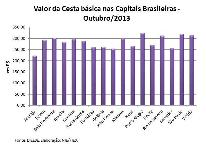 Análise realizada pelo Boletim Sergipe Econômico, parceria do Núcleo de Informações Econômicas da Federação das Indústrias do Estado de Sergipe (FIES) e do Departamento de Economia da UFS, com base nos dados da Pesquisa Nacional da Cesta Básica, realizada pelo DIEESE, apontou que o valor da cesta básica registrado na capital sergipana, em outubro deste ano, foi R$ 222,55, sendo o segundo menor valor registrado por Aracaju este ano, maior apenas que o preço da cesta do último mês de setembro (R$ 220,68). O valor da cesta básica sergipana permaneceu o mais baixo do país, seguido por João Pessoa (R$ 254,45). O maior valor foi registrado em Porto Alegre (R$ 324,87), seguido por São Paulo (R$ 321,14) e Vitória (R$ 313,78).