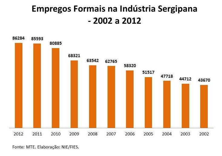 Do total de empregos formais em Sergipe, o setor industrial responde por 22,2% do total, possuindo 86.284 trabalhadores. Os empregos formais do setor foram 0,8% maiores quando comparado com o ano anterior, além de ser quase o dobro do total de empregados de 2002. Dentro do setor, destaca-se como maiores geradores de emprego o segmento da Indústria de Transformação e da Construção Civil que, em 2012, possuíam 46.653 e 28.967 trabalhadores formais, respectivamente. Na indústria de Transformação, a maioria dos trabalhadores formais se encontra nos setores tradicionais da economia sergipana: Alimentos e bebidas (11.332 empregados), Indústria Têxtil (6.984 empregados), Prod. Mineral não Metálico (6.263 trabalhadores) e a Indústria de Calçados (5.887 trabalhadores).