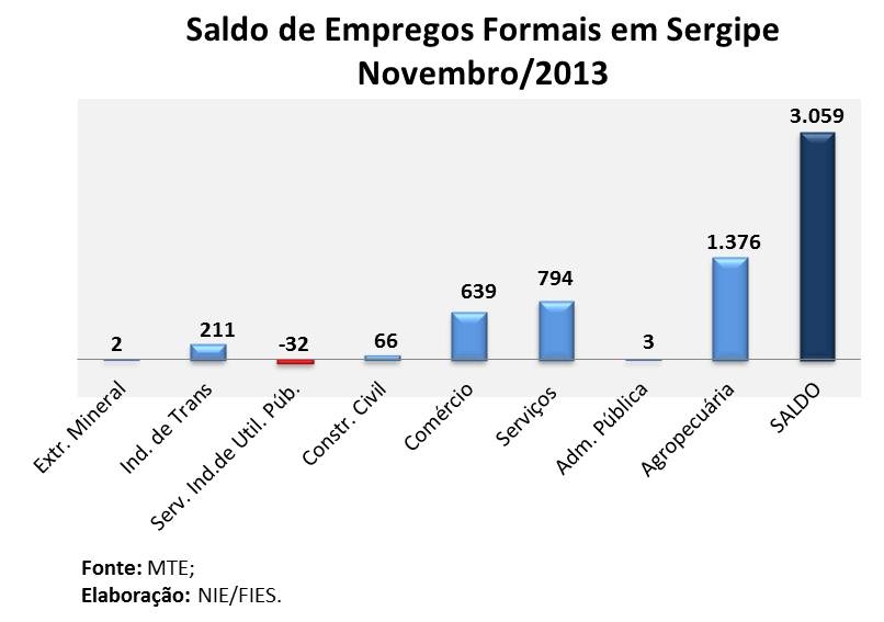 Análise realizada pelo Boletim Sergipe Econômico, uma parceria do Núcleo de Informações Econômicas (NIE) da Federação das Indústrias do Estado de Sergipe (FIES) e do Departamento de Economia da UFS, baseada em dados do Cadastro Geral de Empregados e Desempregados (CAGED), do MTE, revelou que, no mês de novembro de 2013, o saldo de empregos (total de admissões menos total de desligamentos) com carteira assinada foi de 3.059 novos postos de trabalho, segundo melhor resultado deste ano, abaixo apenas do total do mês de outubro (4.993 novos empregos). Este valor foi bastante superior ao total de empregos gerados em novembro de 2012, quando o estado havia gerado 748 novos postos de trabalho.