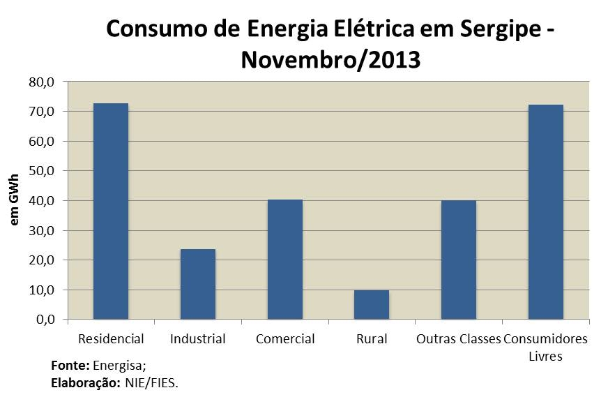 Análise realizada pelo Boletim Sergipe Econômico, parceria do Núcleo de Informações Econômicas da Federação das Indústrias do Estado de Sergipe (FIES) e do Departamento de Economia da UFS, com base nos dados da Energisa, (que gera e distribui energia para 63 municípios sergipanos, alcançando 96% do território do estado), constatou que o consumo de energia elétrica no estado totalizou 186,6 Gigawatts-hora (Gwh) no mês de novembro de 2013.