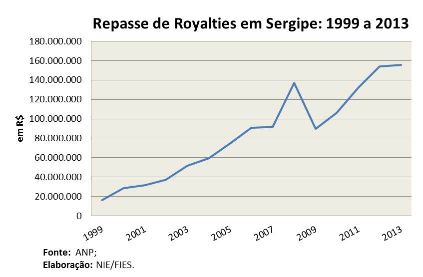 Análise realizada pelo Boletim Sergipe Econômico, uma parceria do Núcleo de Informações Econômicas (NIE) da Federação das Indústrias do Estado de Sergipe (FIES) e do Departamento de Economia da UFS, com base nos dados da ANP, indicou que o pagamento de royalties do petróleo e gás natural em Sergipe somou mais de R$ 155 milhões em 2013. O montante foi levemente maior quando comparado com o ano anterior, apresentando alta de 1,2% em relação a 2012.