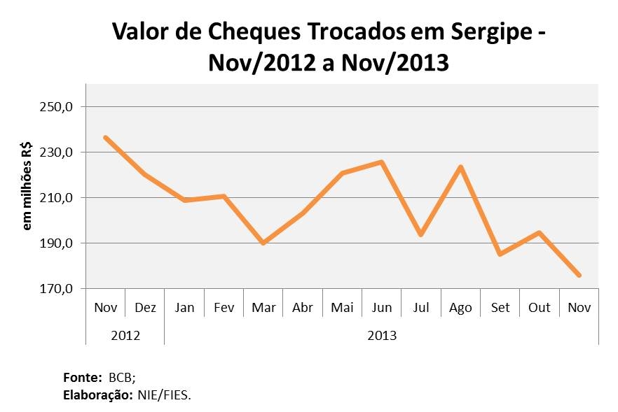 Análise realizada pelo Boletim Sergipe Econômico, parceria do Núcleo de Informações Econômicas (NIE) da Federação das Indústrias do Estado de Sergipe (FIES) e do Departamento de Economia da UFS, com base nas estatísticas do Banco Central, mostrou que, em novembro de 2013, o valor de cheques trocados registrou R$ 175,7 milhões, sendo 19,8% menor que o valor dos cheques compensados no último mês de outubro, quebrando o ciclo de duas altas mensais consecutivas. Ao se comparar com novembro do ano anterior, o valor transacionado por cheques foi 20% menor. O valor total de cheques trocados esse ano também está menor, com volume 10,0% inferior, em comparação ao mesmo período de 2012.