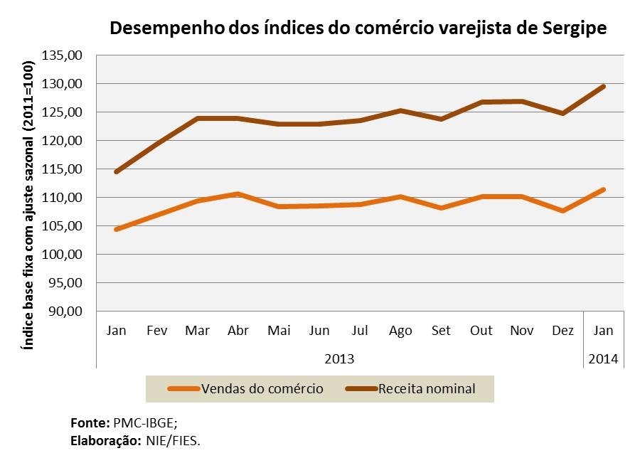 Análise realizada pelo Boletim Sergipe Econômico, parceria do Núcleo de Informações Econômicas da Federação das Indústrias do Estado de Sergipe (FIES) e do Departamento de Economia da UFS, com base nos dados da Pesquisa Mensal do Comércio (PMC) do IBGE, apontou que as vendas do comércio varejista elevaram-se 6,8% em janeiro deste ano, sobre o mesmo mês de 2013. Em relação ao mês imediatamente anterior, nos dados com ajuste sazonal (realizado para uniformizar os períodos de comparação), verificou-se que as vendas no comércio varejista registraram avanço de 3,4% no comparativo com o último mês de dezembro.