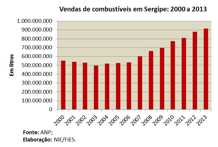 Análise realizada pelo Boletim Sergipe Econômico, uma parceria do Núcleo de Informações Econômicas (NIE) da Federação das Indústrias do Estado de Sergipe (FIES) e do Departamento de Economia da UFS, a partir dos dados da ANP, revelou que em 2013, foram vendidos 914 milhões de litros de combustíveis no estado. Esse foi o maior volume vendido em 13 anos. No comparativo com 2012, as vendas aumentaram 4,0%.