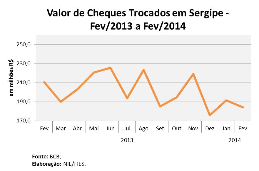 Análise realizada pelo Boletim Sergipe Econômico, parceria do Núcleo de Informações Econômicas (NIE) da Federação das Indústrias do Estado de Sergipe (FIES) e do Departamento de Economia da UFS, com base nas estatísticas do Banco Central, mostrou que, em fevereiro desse ano, o valor de cheques trocados em Sergipe registrou R$ 184 milhões, sendo menor (-4,2%) que o valor dos cheques compensados no último mês de janeiro. Ao se comparar com fevereiro do ano passado, o valor transacionado por cheques foi 3,1% menor.