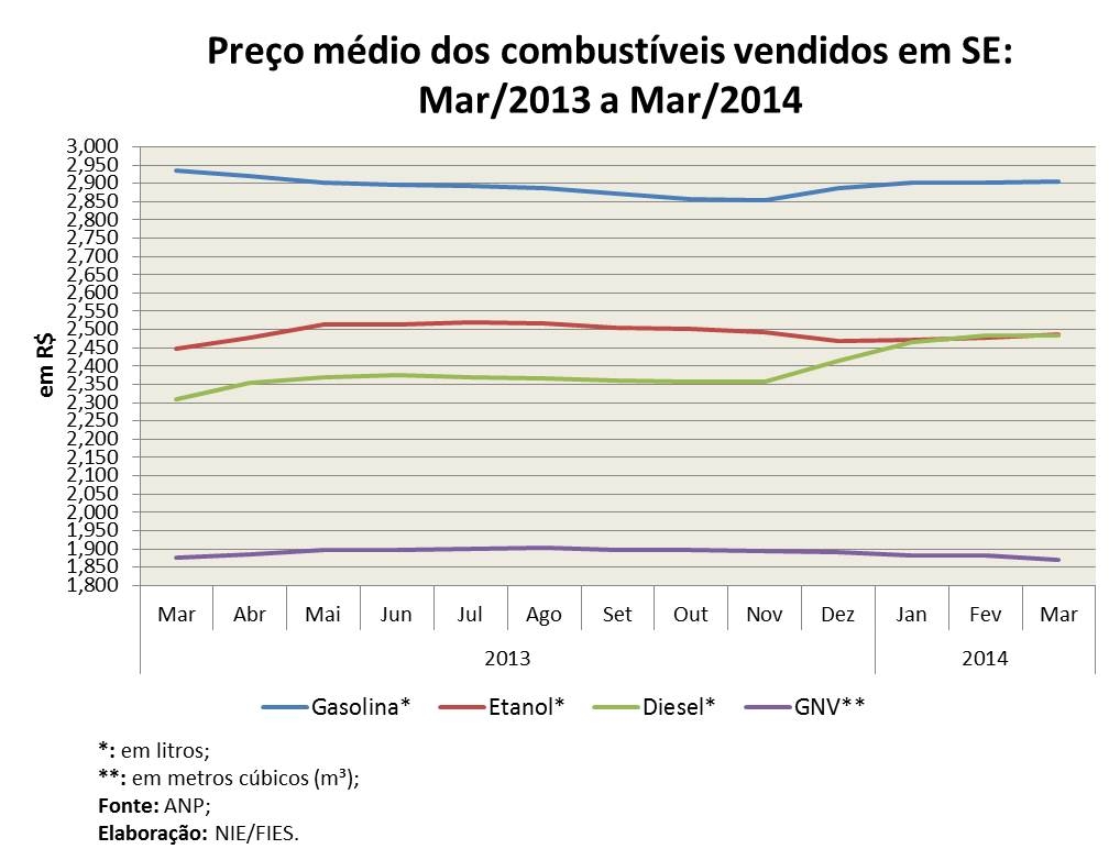 Análise realizada pelo Boletim Sergipe Econômico, parceria do Núcleo de Informações Econômicas da Federação das Indústrias do Estado de Sergipe (FIES) e do Departamento de Economia da UFS, com base nos dados da ANP, indicou que o preço médio vendido pelo litro da gasolina no estado ficou em R$ 2,906, no mês passado, com queda de 1% sobre março de 2013. Em relação a fevereiro último, o preço médio sofreu leve aumento de 0,10%. De acordo com a coleta de preços realizada pela ANP em 35 postos do estado, o preço mínimo encontrado da gasolina foi de R$ 2,699, enquanto que o preço máximo situou-se em R$ 3,12.