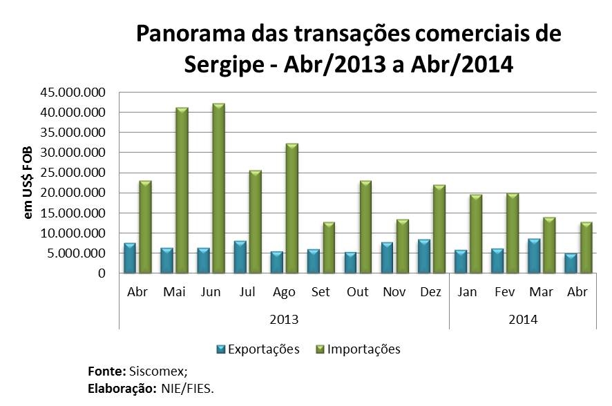 Análise realizada pelo Centro Internacional de Negócios – CIN/SE da FIES, com base nos dados do Ministério de Desenvolvimento, Indústria e Comércio Exterior (MDIC), observou que as exportações sergipanas somaram US$ 4,9 milhões no quarto mês do ano. As importações sergipanas somaram US$ 12,8 milhões. Com estes resultados, a balança comercial do estado somou um déficit (saldo negativo) de US$ 7,9 milhões no mês de abril desse ano.