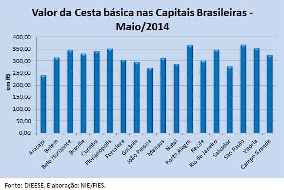 Em relação ao mês de abril, o preço da cesta básica de Aracaju subiu 1,5%. Em relação ao mesmo mês do ano anterior (maio/2013), o valor da cesta apresentou leve alta de 0,4% (sem levar em consideração a inflação do período). No mês de maio apenas duas das cidades pesquisas apresentaram redução nos preços de suas cestas básicas na comparação anual, foram elas: João Pessoa (-5,0%) e Manaus (-3,1%).