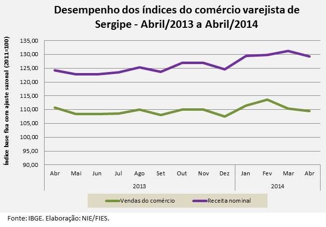 Análise realizada pelo Boletim Sergipe Econômico, parceria do Núcleo de Informações Econômicas da Federação das Indústrias do Estado de Sergipe (FIES) e do Departamento de Economia da UFS, com base nos dados da Pesquisa Mensal do Comércio (PMC) do IBGE, apontou que a receita nominal do comércio varejista cresceu em relação ao ano passado. Em comparação a abril de 2013, a alta foi de 7,6%. Já em termos acumulados, a receita nominal está 8,5% maior que a receita do mesmo período do ano passado.