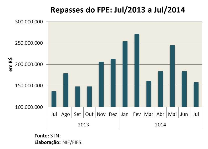 A transferência do FPM (Fundo de Participação dos Municípios) para todos os municípios do estado totalizou R$ 59,2 milhões, no mês analisado. Em termos relativos, houve alta, também descontada a inflação pelo IGP-DI, de 10,0% na comparação anual (julho/2013). No comparativo mensal (junho/2014), verificou-se retração de 13,6%.