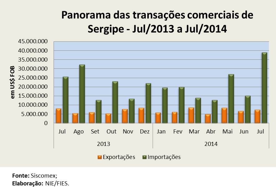 Análise realizada pelo Centro Internacional de Negócios – CIN/SE da FIES, com base nos dados do Ministério de Desenvolvimento, Indústria e Comércio Exterior (MDIC), observou que as exportações sergipanas somaram US$ 7,2 milhões em julho, sendo o terceiro maior valor registrado esse ano, enquanto as importações sergipanas somaram US$ 39 milhões. Com estes resultados, a balança comercial do estado somou um déficit (saldo negativo) de US$ 31,8 milhões, no mês analisado.