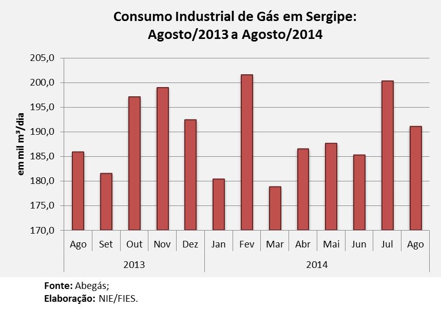 Análise realizada pelo Boletim Sergipe Econômico, parceria do Núcleo de Informações Econômicas da Federação das Indústrias do Estado de Sergipe (FIES) e do Departamento de Economia da UFS, com base nos dados da Abegás, apontou que, em agosto desse ano, o consumo de gás das indústrias sergipanas chegou a 191,1 mil metros cúbicos (m³) por dia. O volume foi 2,8% maior que o verificado no mesmo mês de 2013. No acumulado do ano, as indústrias de Sergipe apresentaram uma alta de 4,8% no consumo de gás, em relação aos oito primeiros meses do ano passado.