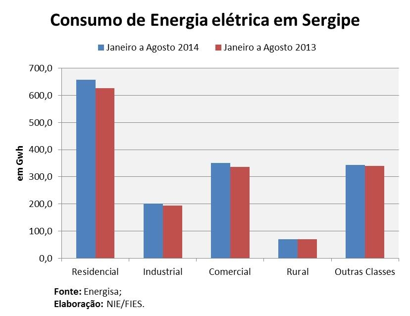 Análise realizada pelo Boletim Sergipe Econômico, parceria do Núcleo de Informações Econômicas da Federação das Indústrias do Estado de Sergipe (FIES) e do Departamento de Economia da UFS, com base nos dados da Energisa, (que gera e distribui energia para 63 municípios sergipanos, alcançando 96% do território do estado), indicou que o consumo de energia elétrica no estado atingiu 187,8 Gigawatts-hora (Gwh), no oitavo mês do ano. No comparativo com agosto do ano passado, houve crescimento de 4,5% no consumo, enquanto que sobre julho último verificou-se leve aumento de 0,9%.