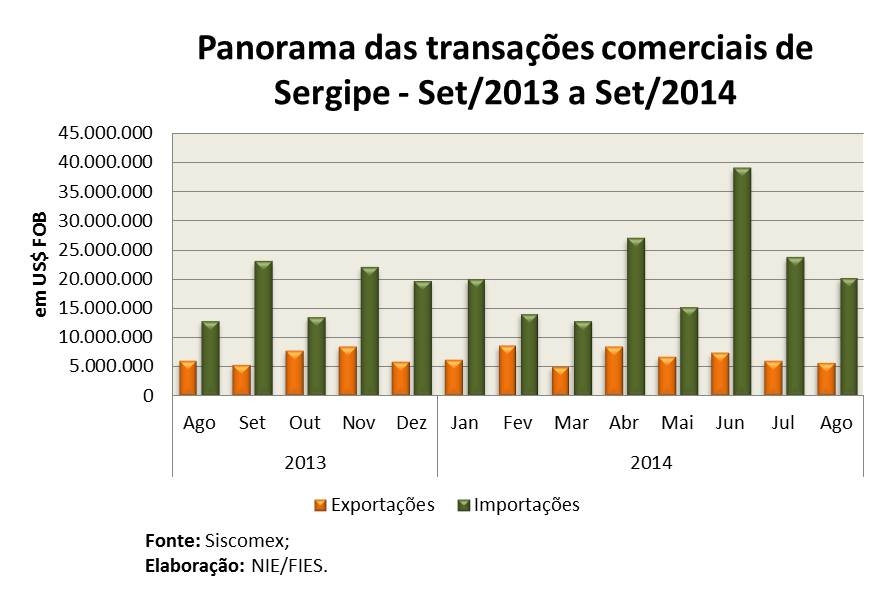 Análise realizada pelo Centro Internacional de Negócios – CIN/SE da FIES, com base nos dados do Ministério de Desenvolvimento, Indústria e Comércio Exterior (MDIC), observou que as exportações sergipanas somaram US$ 5,5 milhões, em setembro, enquanto as importações sergipanas somaram US$ 20,1 milhões. Com estes resultados, a balança comercial do estado somou um déficit (saldo negativo) de US$ 14,6 milhões, no mês analisado. No ano (de janeiro a setembro), o montante exportado somou US$ 58,6 milhões, estando 7,5% menor que o total vendido no mesmo período de 2013. As importações, cujo total foi US$ 191,3 milhões, também estão menores, nesta mesma análise, com redução de 17,6%.