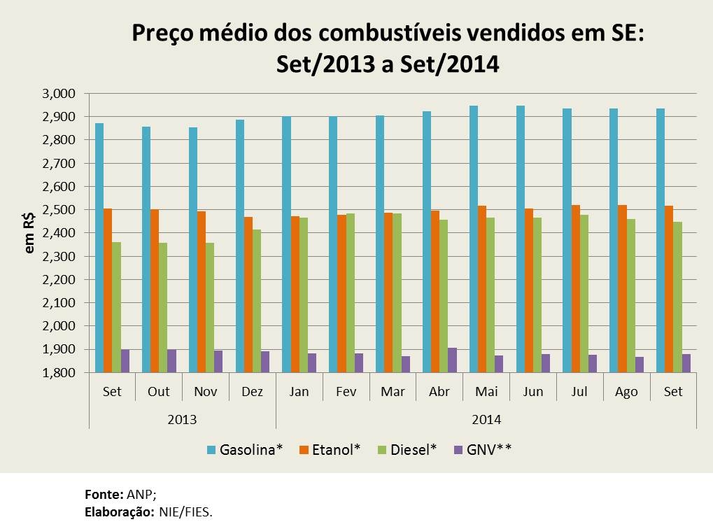 Análise realizada pelo Boletim Sergipe Econômico, parceria do Núcleo de Informações Econômicas da Federação das Indústrias do Estado de Sergipe (FIES) e do Departamento de Economia da UFS, com base nos dados da ANP, apontou que o preço médio da gasolina vendida no estado, em setembro desse ano, aumentou 2,23% na comparação com setembro do ano passado. O valor médio vendido pelo litro do combustível ficou em R$ 2,935 no mês analisado, enquanto no nono mês de 2013 havia sido R$ 2,871. Em relação a agosto desse ano, o preço médio manteve-se, praticamente, igual.