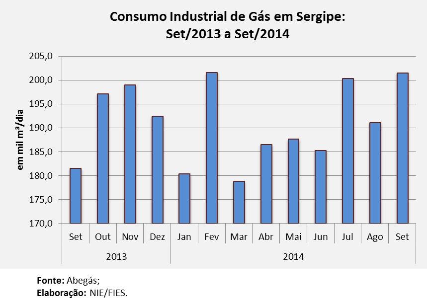 Análise realizada pelo Boletim Sergipe Econômico, parceria do Núcleo de Informações Econômicas da Federação das Indústrias do Estado de Sergipe (FIES) e do Departamento de Economia da UFS, com base nos dados da Abegás, apontou que, em setembro desse ano, foram consumidos 303,8 mil m³/dia de gás, com alta de 11,4% no comparativo anual (setembro/2013), além de um consumo 5,2% maior no acumulado do ano, comparando-se com o mesmo período do ano anterior.
