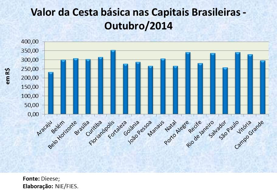 Análise realizada pelo Boletim Sergipe Econômico, parceria do Núcleo de Informações Econômicas da Federação das Indústrias do Estado de Sergipe (FIES) e do Departamento de Economia da UFS, com base nos dados da Pesquisa Nacional da Cesta Básica, realizada pelo DIEESE, apontou que o valor da cesta básica registrado na capital sergipana foi R$ 232,82 em outubro, mantendo-se o menor do país. Em seguida, aparecem com o menor preço da cesta básica as cidades de Salvador (R$ 257,80) e Natal (R$ 265,27).